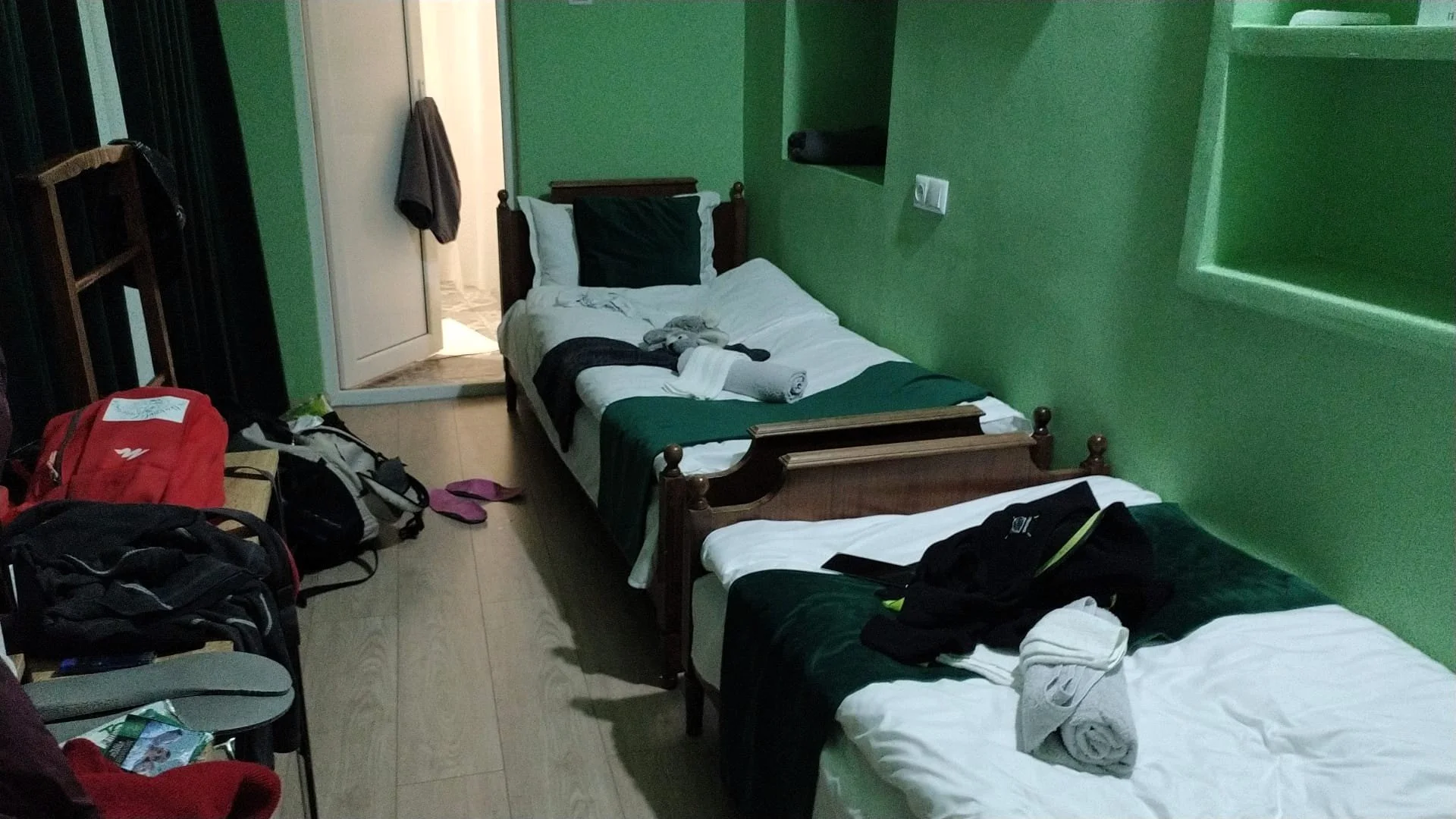 Vuelo Madrid-Tiflis. Ya en la escala de Atenas casi perdemos el vuelo hacia nuestro destino Tiflis porque no teníamos seguro médico, es una nueva ley de enero 2026 de la cual no nos habíamos enterado, dado que el viaje estaba casi todo planeado. Contratamos un seguro online mientras nos controlaban los pasaportes en la cola de embarque; tuvimos suerte que nos esperaron. A la llegada nocturna en Georgia nos quedamos en el aeropuerto toda la noche a descansar e ir la mañana siguiente con el bus hacia el centro.
